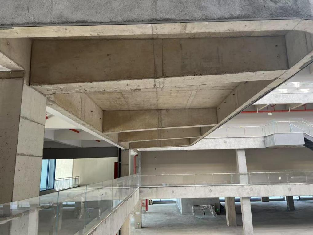 技術(shù)創(chuàng)新:通過對(duì)撓度和裂縫進(jìn)行控制,達(dá)到砼框架結(jié)構(gòu)6米大懸挑的要求;采用寬扁梁以及給排水管道穿梁的做法解決要求最大凈空的要求;中庭采用24米大跨度井字梁結(jié)構(gòu)。